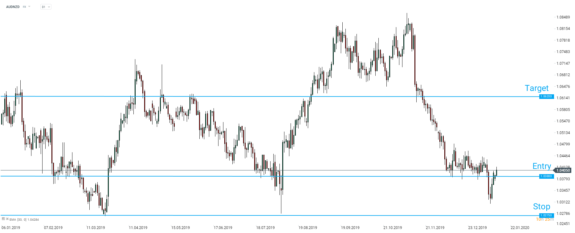 A ANZ recomenda tomar uma posição longa no AUDNZD a preço de mercado com uma meta de 1,0620 e uma ordem de stop loss colocada em 1,0275. Fonte: xStation5