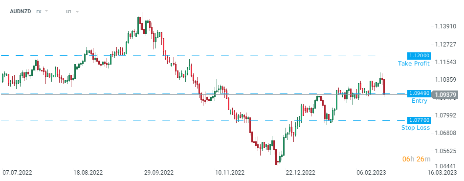 Credit Suisse recomenda entradas longas no par AUDNZD nos 1.0949 e target a 1.1200 bem como o stop loss a 1.0770. Fonte: xStation5