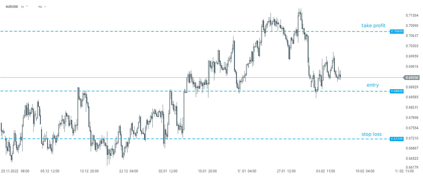 O ANZ  recomenda colocar posições longas com um buy limit nos 0.688 no AUDUSD com target nos 0.7080 e stop loss nos 0.6720. Fonte: xStation5