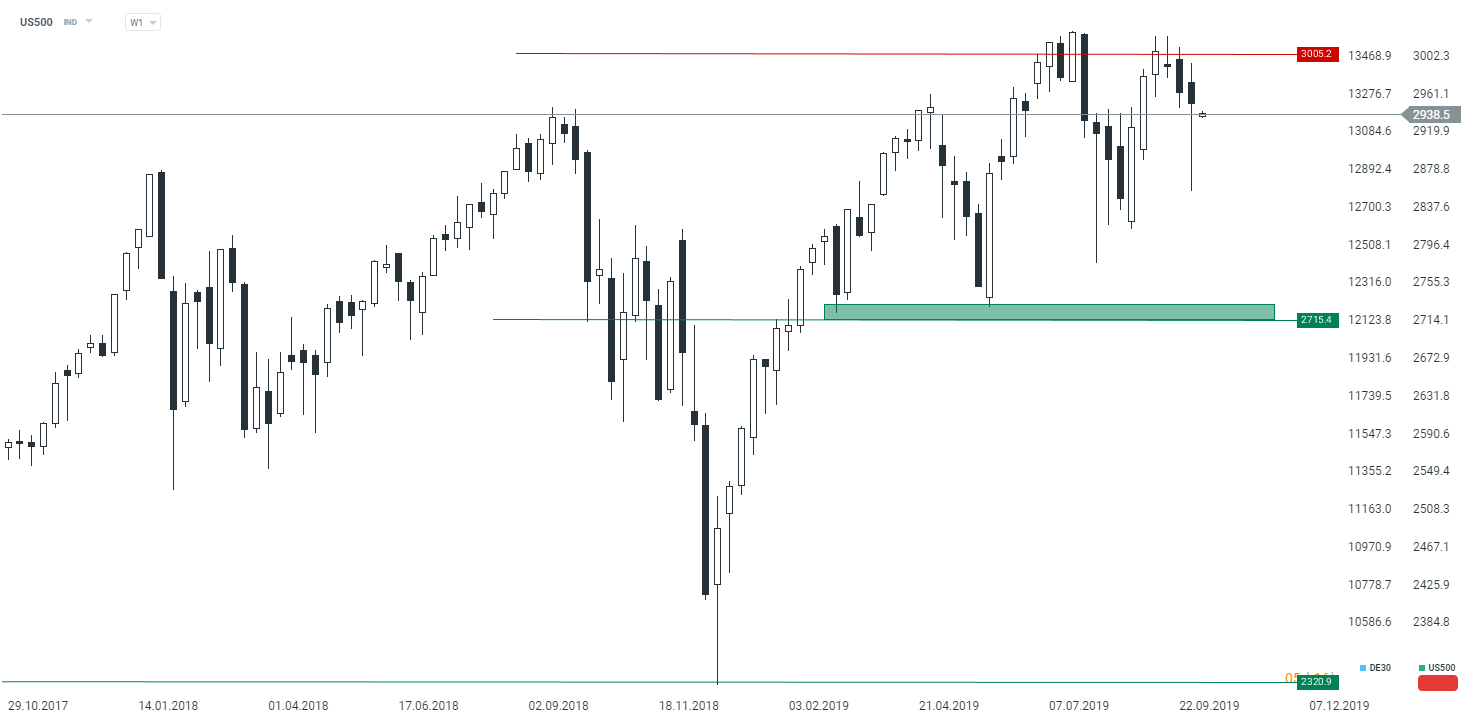 O US500 iniciou a nova semana de negociação em baixa, após os declínios registrados nas últimas duas semanas. Fonte: xStation5