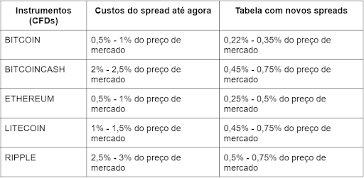 Como tal, a fim de satisfazer as expectativas dos nossos clientes, a XTB decidiu reduzir o custo das negociações em todos os CFDs de criptomoedas na sua oferta (tabela abaixo).