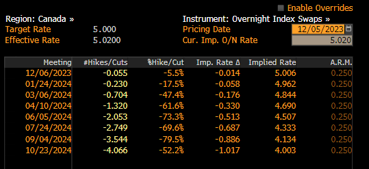 Os economistas inquiridos pela Bloomberg e pela Reuters esperam que o banco central canadiano mantenha as taxas inalteradas, com a taxa de juro principal a permanecer em 5,00% pela terceira reunião consecutiva. Esta é também a opinião dos mercados monetários, com os swaps de índice overnight a preverem uma probabilidade de 5% de o BdC efetuar um corte de 25 pontos de base nas taxas na reunião desta semana. Os mercados prevêem o primeiro corte de 25 pontos de base para abril de 2024, com 100 pontos de base de flexibilização acumulada para todo o ano de 2024