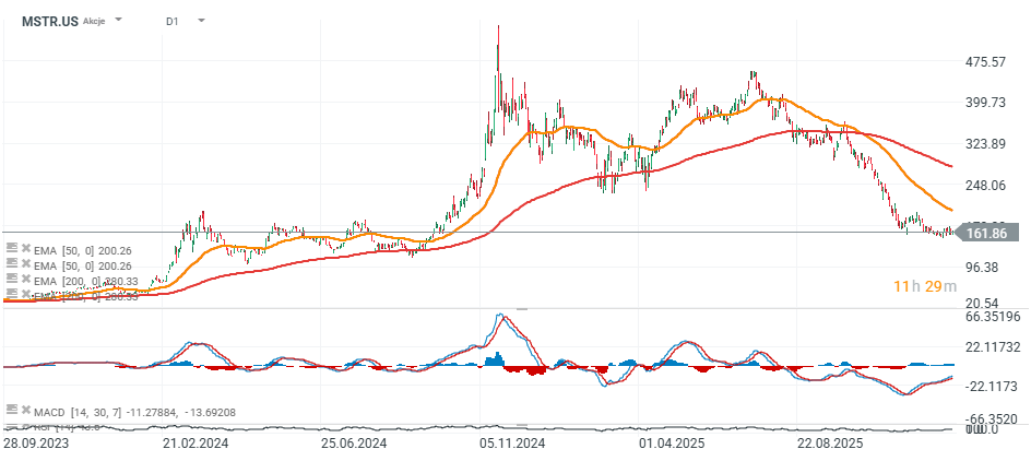 As ações da MSTR caíram quase 70% em relação às suas máximas, algo que, nos últimos anos, ocorreu normalmente apenas durante mercados baixistas profundos do Bitcoin. Por um lado, as ações enfrentam a “concorrência” dos ETF's spot de Bitcoin, que reduzem a procura do mercado tradicional pelas ações da empresa como uma espécie de “proxy” para a exposição direta ao BTC. Por outro lado, qualquer retorno de um mercado altista do BTC deve claramente reanimar as ações de níveis profundamente sobrevendidos. Os indicadores RSI e MACD estão a subir e, se o Bitcoin conseguir ultrapassar os 95 000 dólares, a recuperação do preço das ações poderá acelerar significativamente.