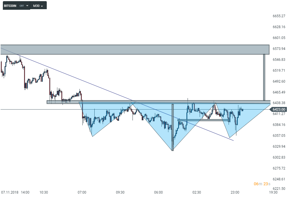 Depois de uma quebra da LTD a bitcoin começou a consolidar e registou um h&s de curto prazo cuja cabeça do padrão coincide com um retest da LTD ,zona onde vemos grandes sombras a rejeitar a queda. Setup básico para um trade altista de curto prazo em que a entrada é perante um breakout e tp a amplitude do h&s que coincide com a anterior zona de máximos. Stop depois de entrar fica abaixo da neckline.