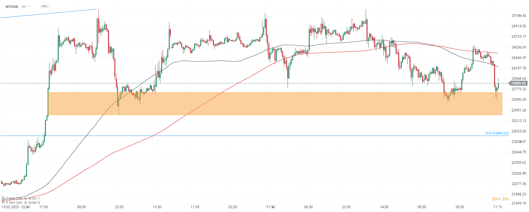 Bitcoin, gráfico 30 minutos. A BTC voltou a posicionar-se abaixo da SMA100 e SMA200. Fonte: xStation5