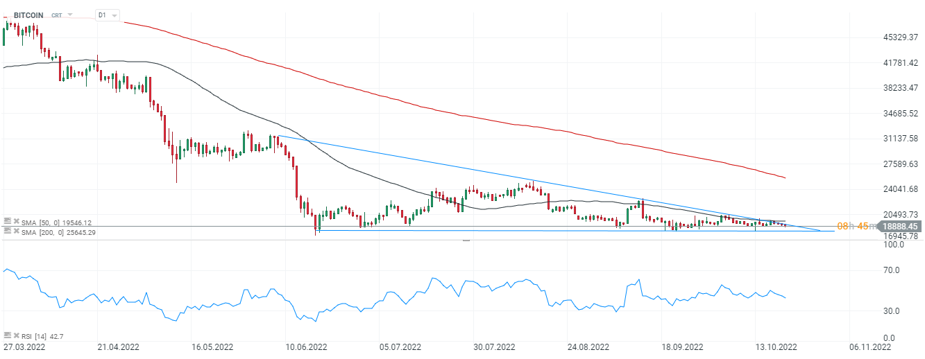 Bitcoin, gráfico D1. Os vendedores estão mais uma vez a pressionar o preço da BTC que poderá quebrar abaixo do atual range. Fonte: xStation5