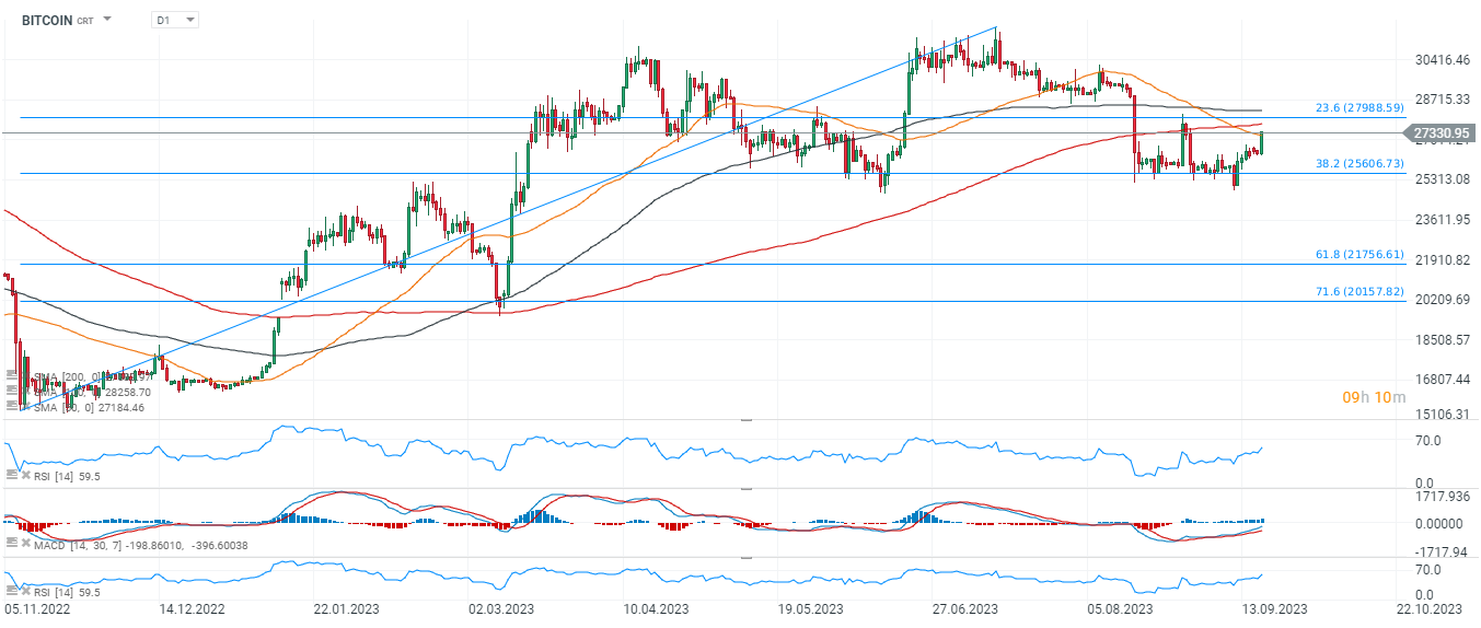 - Vale a pena ter em mente que, como os dados da economia dos EUA permanecem fortes, o Fed poderia sinalizar outro aumento da taxa que, por sua vez, potencialmente fortaleceria o dólar. No entanto, se não o fizer de uma forma suficientemente decisiva, o dólar poderá ficar sob pressão. Uma vez que o BCE manteve as taxas inalteradas na semana passada, o mercado está a começar a especular que as taxas da Reserva Federal também podem não subir se permanecerem inalteradas em setembro (o mercado vê apenas 1% de hipóteses de uma subida em setembro);