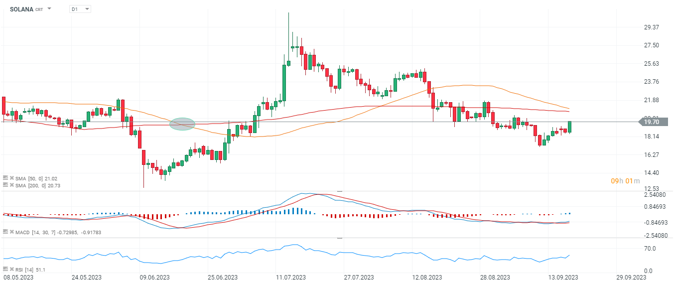 A SOLANA também tem estado muito vulnerável às condições de mercado. Contudo, conseguimos ver que os compradores também estão a tentar recuperar o controlo do preço. O próximo obstáculo será marcado pelas médias móveis de 200 e 50 períodos. No caso destas médias serem quebradas, o movimento de alta poderá prolongar-se ainda mais.