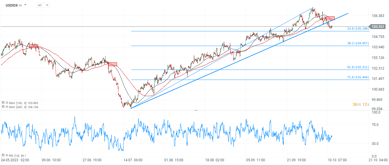 O índice do dólar (USDIDX) está a valorizar cerca de 0,04%. No entanto, ao analisarmos para o gráfico através da análise técnica, conseguimos ver que o preço quebrou o limite inferior do canal que poderá provocar novas pressões de venda no USD.