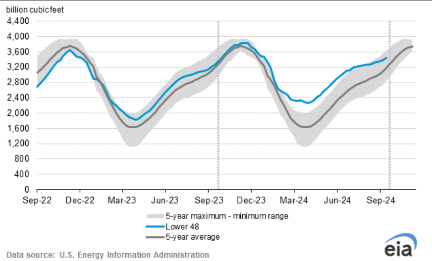 As existências estão a crescer ligeiramente acima das expetativas, embora a taxa de crescimento seja inferior à média de 5 anos. Existe uma forte possibilidade de que os stocks caiam abaixo da média de 5 anos antes do início da estação de aquecimento. Fonte: EIA