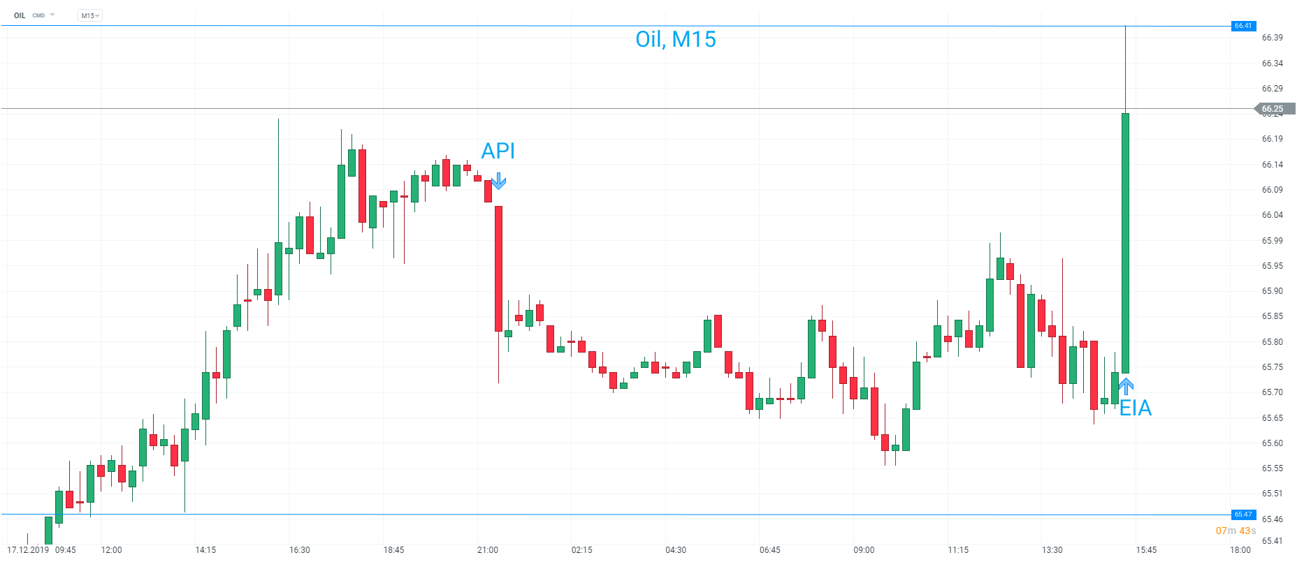 O lançamento da API na noite passada causou uma clara mudança no petróleo, mas o mercado acaba de recuperar-se fortemente - e acima do nível a que estava antes da API - depois dos inventários do EIA. Fonte: xStation