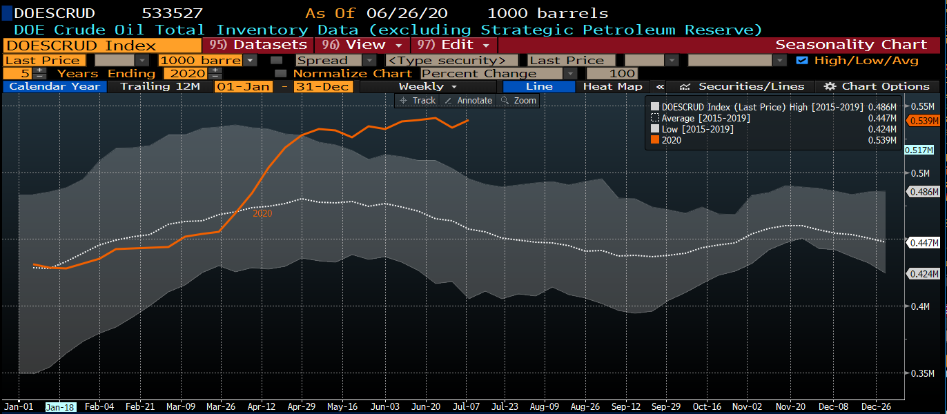 Apesar do grande aumento nos stocks de petróleo nas últimas semanas, estes continuam a aumentar. Fonte: Bloomberg