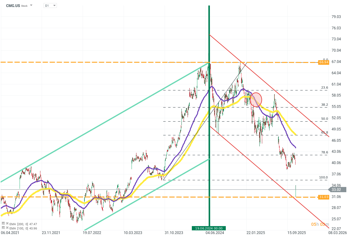 A Chipotle é um dos símbolos do fast food nos EUA. Eles publicaram resultados após os quais o preço das ações despencou, apesar de a empresa ter superado o consenso do mercado. A empresa falhou em uma área extremamente crucial, sinalizando aos investidores que o crescimento atual e esperado é quase impossível de ser alcançado. Após a publicação, as ações caíram cerca de 16%.