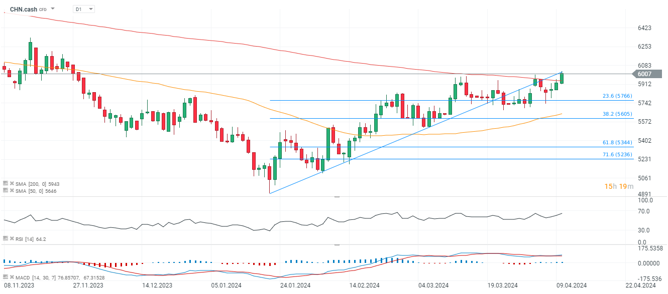 Os futuros do índice Hang Seng Index (CHN.cash) estão a subir esta sessão e os compradores conseguiram ultrapassar acima da SMA200 (linha vermelha) perto dos 6000 pontos.