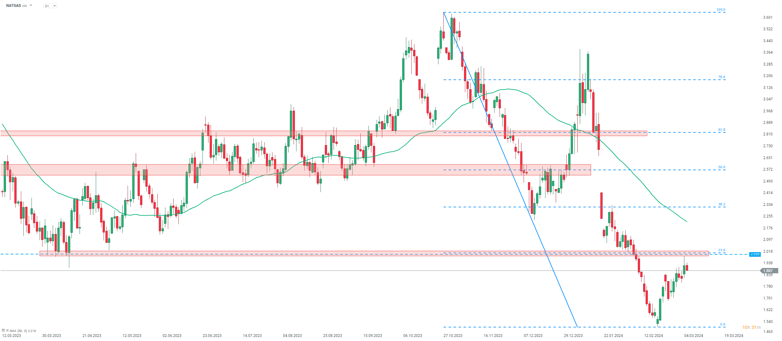 Os preços do gás natural dos EUA (NATGAS) estão a negociar cerca de 25% acima dos mínimos de meados de fevereiro. O preço subiu com o anúncio da EQT ontem e testou a área dos $2,00 por MMBTu. No entanto, os bulls não conseguiram quebrar acima e o preço recuou abaixo da marca de $1,90 hoje. Fonte: xStation5