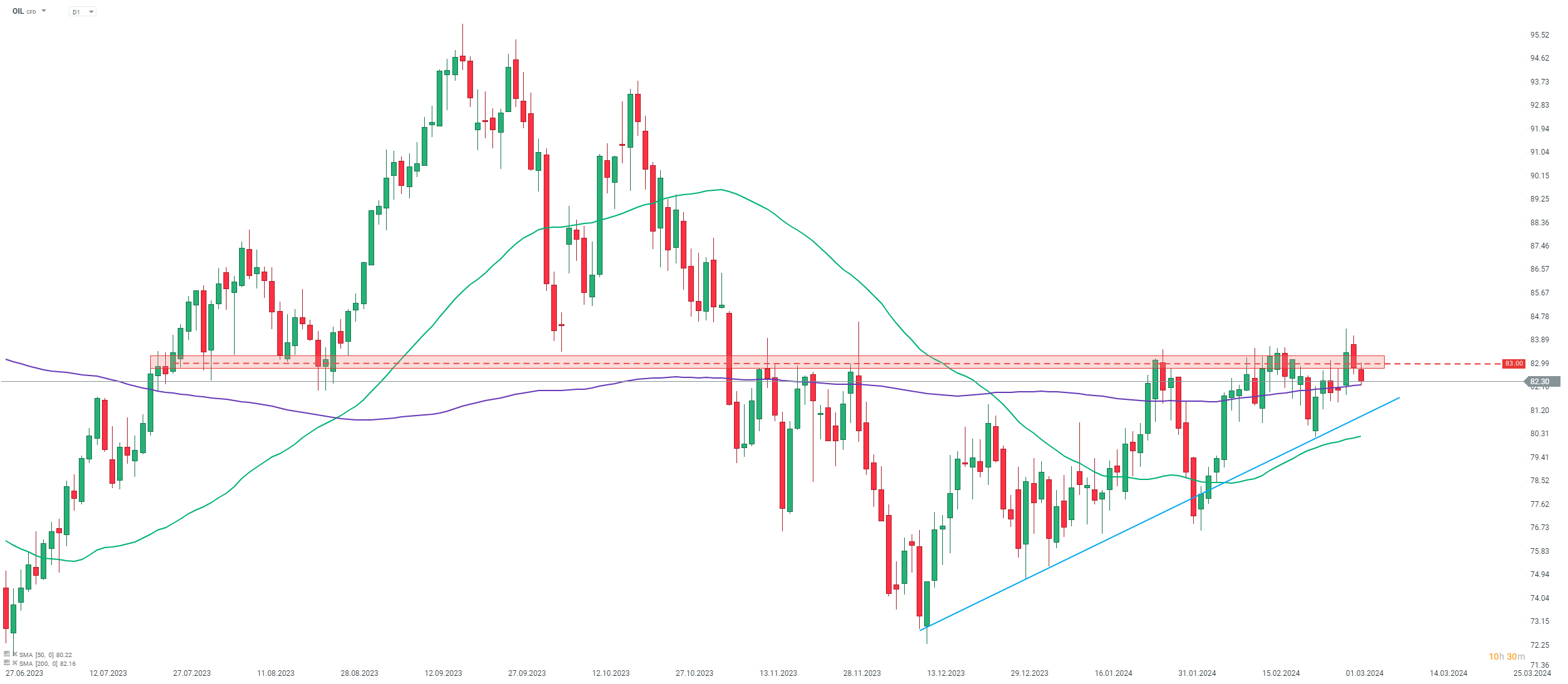 O Brent (OIL) subiu acima da zona de resistência dos $83 por barril e negociou brevemente no nível mais alto desde o final de novembro de 2023. No entanto, os touros não conseguiram manter esses ganhos e o preço recuou abaixo da área dos $83. O anúncio morno de metas econômicas da China hoje está a aumentar a pressão, com o OIL a testar a média móvel de 200 sessões (linha roxa). Fonte: xStation5