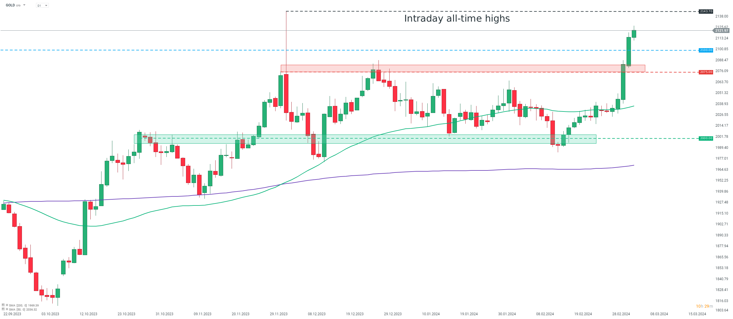 O ouro fechou acima de 2.100 dólares por onça ontem pela primeira vez na história. No entanto, o preço ainda é negociado cerca de 1% abaixo dos máximos intradiários de todos os tempos alcançados no início de dezembro de 2023. Fonte: xStation5.