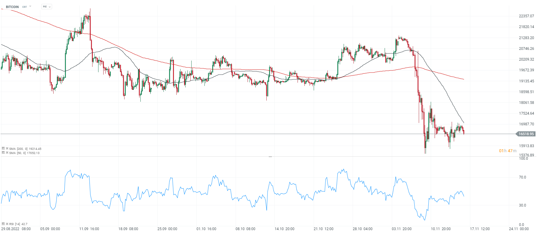 Gráfico de bitcoin, intervalo H4. O preço da Bitcoin está novamente a recuar para a área de 16.500 dólares apesar das tentativas de ontem de subir acima dos 17.000 dólares. A intersecção das médias SMA200 e SMA50, que a análise técnica chama de "cruz de morte", assinala uma mudança de tendência. A resistência primária continua a ser o SMA50, que corre a $17.000. Fonte: xStation5