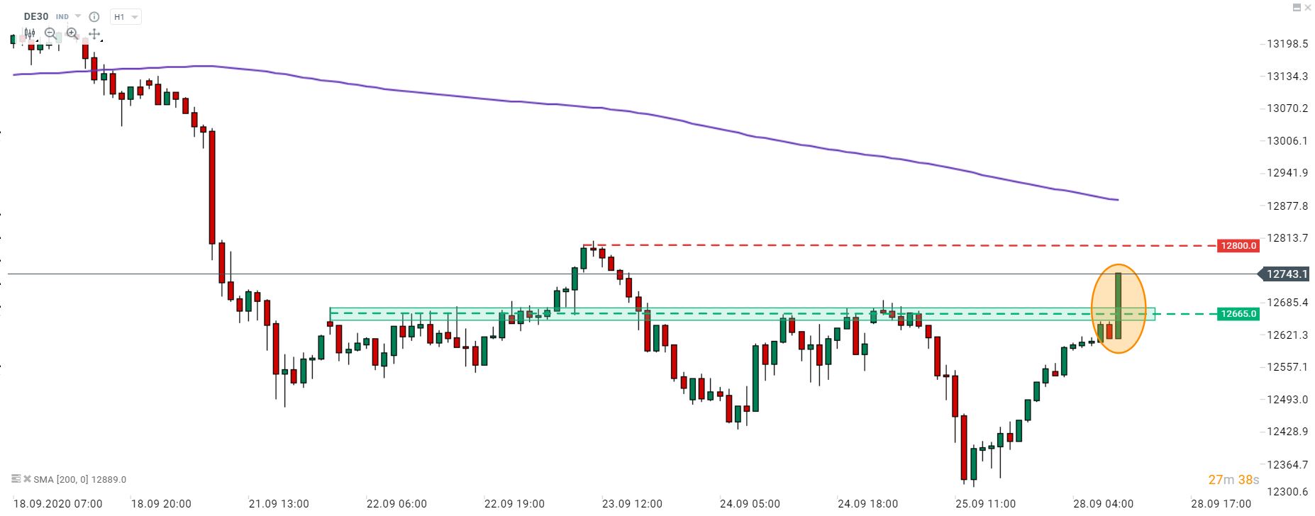 DE30 abriu em alta após a abertura do mercado europeu (círculo laranja). O índice conseguiu romper a barreira nos 12.665 pontos e está próximo do máximo da semana passada nos 12.800 pontos. Fonte: xStation5