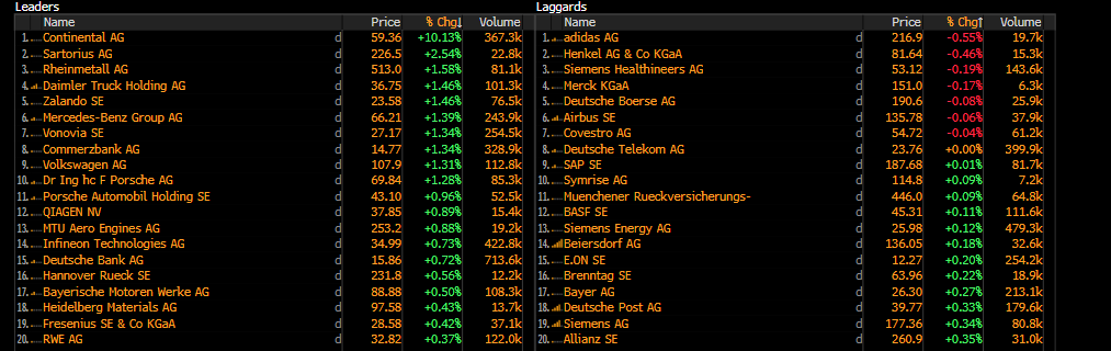 Além dos ganhos da Continental (CON.DE), invariavelmente os compradores estão activos hoje nas acções da Sartorius (SRT.DE) e da Rheinmetall (RHM.DE). Dailmer, Mercedes, Porsche e Volkswagen também estão a fazer melhor. Fonte: Bloomberg Financial L.P.