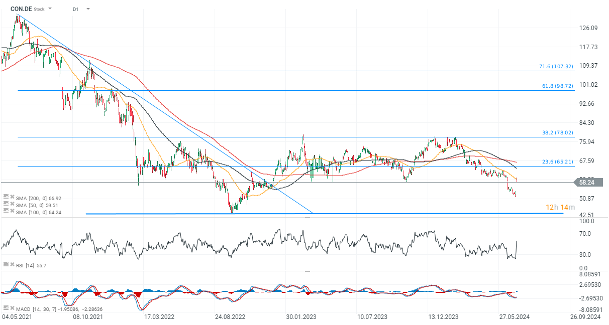 As ações da Continental estão a ganhar quase 8% hoje, mas os ganhos iniciais de mais de 12% foram rapidamente satisfeitos com a realização de lucros e o preço atual das ações está novamente a ser negociado ligeiramente abaixo da SMA50 (linha laranja). Para testar a força da tendência, ao nível da SMA200, a ação ainda carece de um crescimento de quase 20%.