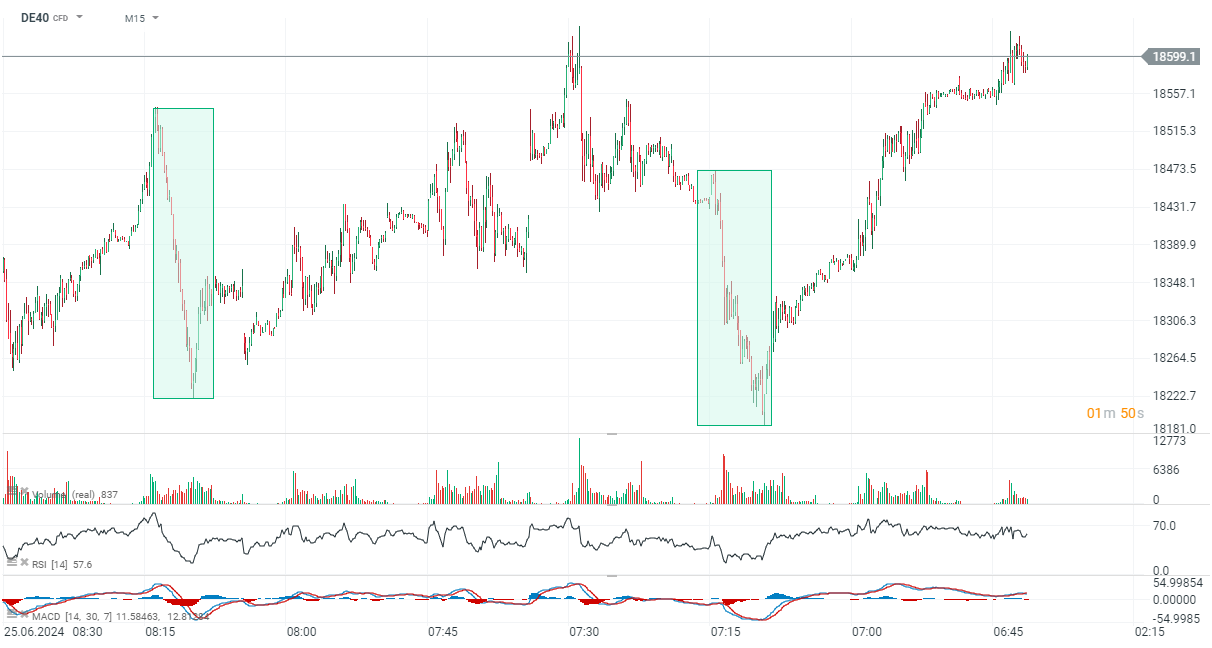 Olhando para os futuros do DAX a curto prazo, vemos que o índice tem atrás de si uma subida significativa de quase 400 pontos, cuja escala é muito semelhante à do impulso anterior, seguida de uma correção dinâmica. Uma repetição de tal cenário iria certamente prejudicar o sentimento, enquanto os índices de referência europeus podem contar com uma "brisa" favorável dos EUA, onde Wall Street está a ir muito bem e as expectativas de um corte nas taxas da Fed no outono estão a aumentar. Um teste de resistência no nível de 18.700 plt. poderia abrir o caminho para o índice atingir o nível psicológico perto de 19.000 pontos.
