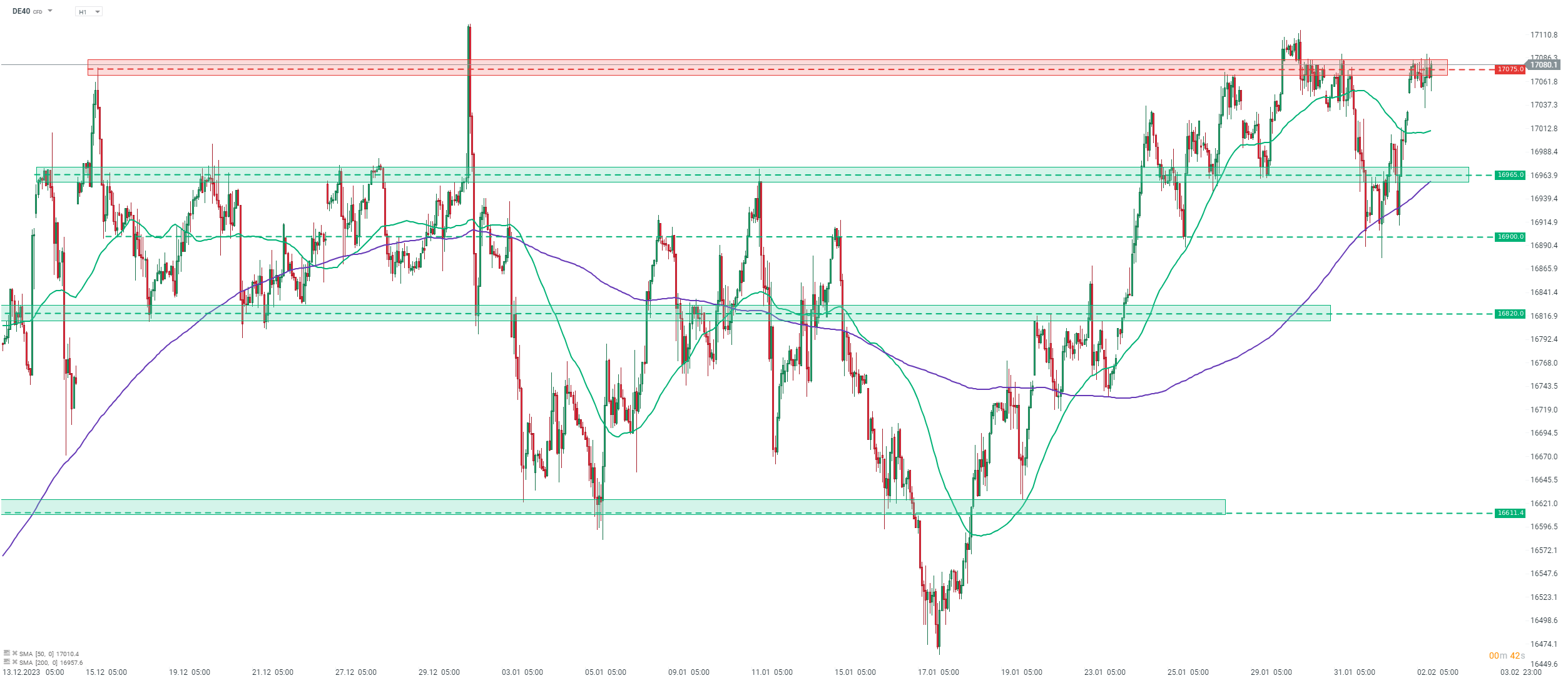 Os futuros do DAX (DE40) negoceiam hoje em alta. Os ganhos sólidos da Amazon e da Meta Platforms apoiaram o sentimento nos mercados de ações e permitiram que os índices dos EUA e da Europa apagassem completamente a queda pós-FOMC. Dando uma olhada no gráfico DE40 no intervalo H1, podemos ver que o índice está mais uma vez a negociar acima da marca de 17.000 pontos e a uma distância pequena dos máximos de todos os tempos alcançados no início desta semana. Um relatório dovish do NFP às 13:30 GMT, que mostra a desaceleração do crescimento dos salários e um crescimento do emprego mais fraco do que o esperado, pode fornecer um combustível para um movimento em direção a novos máximos históricos. Por outro lado, se o relatório for forte, um recuo não pode ser descartado. Em tal cenário, uma zona de suporte chave a ser observada pode ser encontrada na área de 16.965 pts, marcada com as reações de preços anteriores e a média móvel de 200 horas (linha roxa).