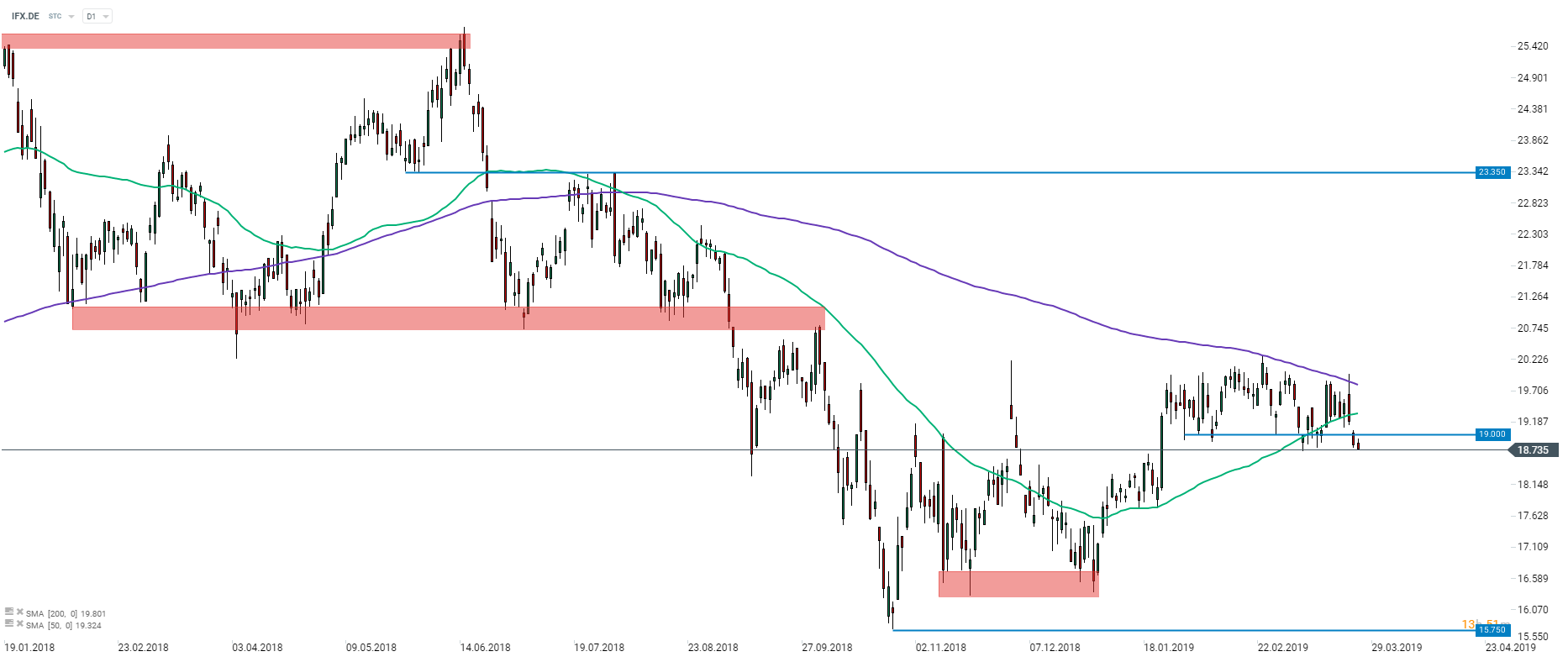 Infineon (IFX.DE) caiu abaixo do nível de suporte em € 19 que limitou os movimentos descendente dos preços desde a virada de 2018 e 2019. As ações estão a ser negociadas abaixo da média móvel de 50 e 200 sessões e caso o preço não suba de volta o nível de suporte acima mencionado, o sentimento pode tornar-se negro. Fonte: xStation5