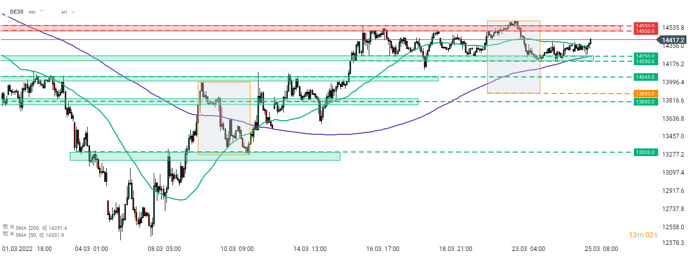 Os compradores conseguiram recuperar o controlo do preço no índice alemão (DE30) perto do limite inferior do range. Além disso, o preço quebrou acima da média móvel de 50 períodos (linha verde) e está agora a aproximar-se do limite superior do range perto dos 14.500-14.550 pts.