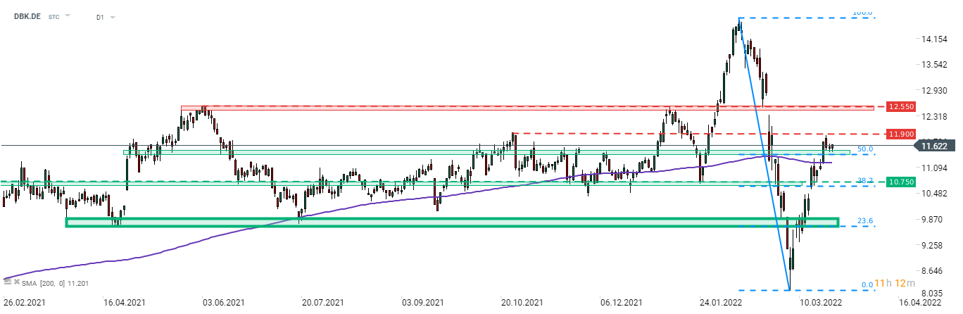 As ações do Deutsche Bank (DBK.DE) estão a recuperar mais de metade das recentes perdas. Os compradores conseguiram ultrapassar acima da zona de resistência marcada pelos níveis de Fibonacci nos 50% e neste momento existe a possibilidade do movimento de alta prolongar-se em direção à marca dos 12,55 euros, se o preço se mantiver acima desta zona de resistência. Fonte: xStation5