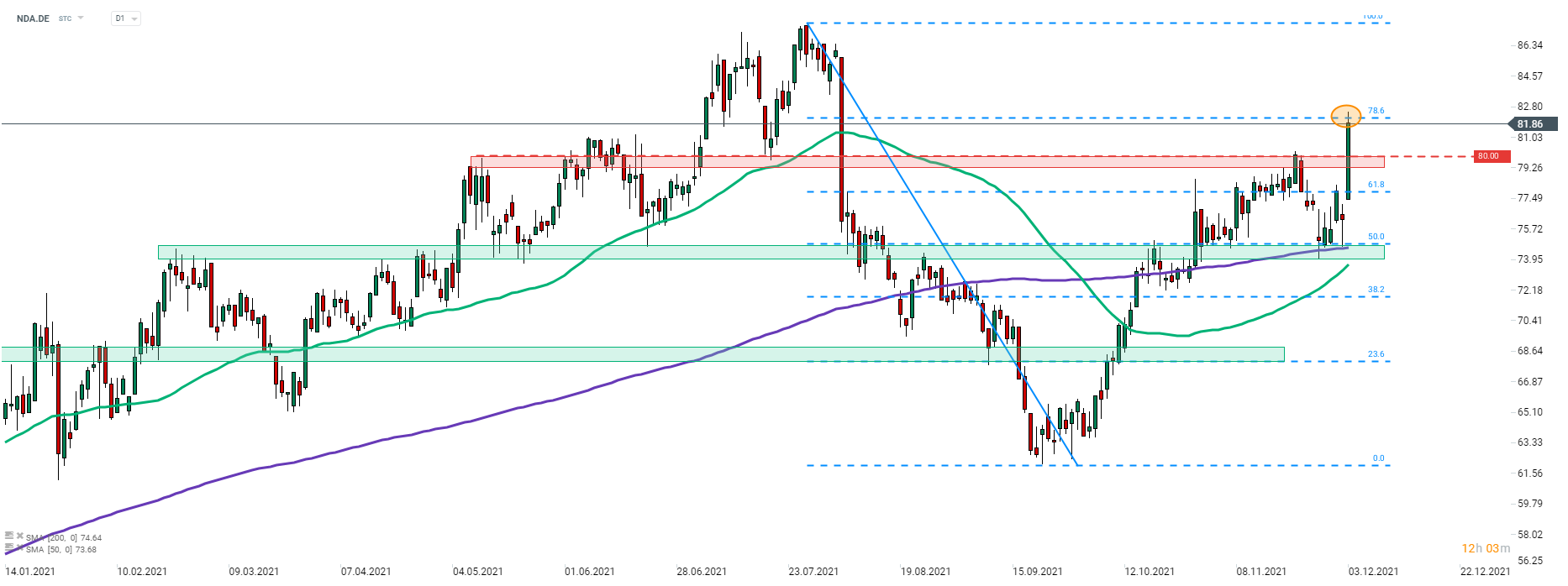 As acções de Aurubis (NDA.DE) foram hoje mobilizadas após a divulgação da previsão de lucros para o ano fiscal de 2022. As acções quebraram acima da zona de resistência dos 80,00 euros e transaccionam mais de 6% acima do fecho de ontem. No entanto, a primeira tentativa de quebra acima dos 78,6% de retracção da correcção Q3 falhou. Fonte: xStation5