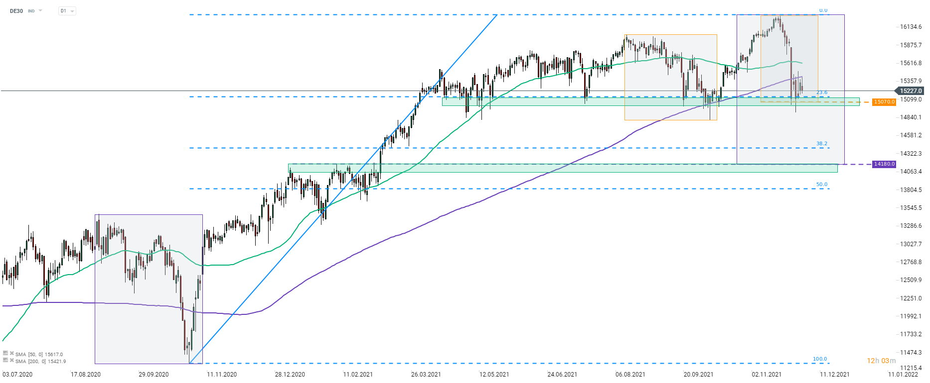 OI DE30 fez uma tentativa falhada de ultrapassar a média móvel das 200 sessões (linha roxa) esta manhã. O índice tem tentado quebrar acima deste obstáculo quase diariamente desde o sell-off da última sexta-feira, mas continua a falhar. O índice está a recuar e um teste de 15,070 pts de zona de apoio não pode ser excluído. No entanto, muito dependerá da divulgação de dados sobre empregos nos EUA no início da tarde (13:30 GMT). Este é um evento chave do dia e espera-se que aumente a volatilidade no mercado de acções. Fonte: xStation5
