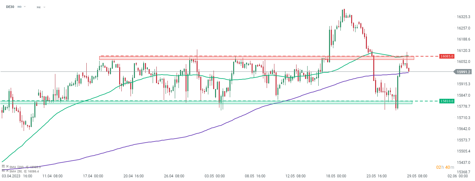 Os futuros do DAX alemão (DE30) conseguiram parar o recente movimento descendente ligeiramente abaixo da área de 15.800 pts, marcando o limite inferior de um intervalo de negociação que durou de meados de Abril a meados de Maio. Um forte movimento de recuperação que se seguiu empurrou o índice para o limite superior do intervalo acima mencionado, ligeiramente abaixo dos 16.100 pts. No entanto, os touros não conseguiram quebrar acima e um recuo pode ser visto no momento da imprensa. Como a obtenção do acordo sobre o teto da dívida dos EUA foi sempre o cenário de base nos mercados, não estamos a observar quaisquer movimentos importantes do mercado em resposta. A falta de um forte catalisador de curto prazo pode ver o índice mais uma vez negociar lateralmente na faixa de 15.800-16.100 pts. Uma quebra clara do intervalo pode sugerir a direção do próximo grande movimento.