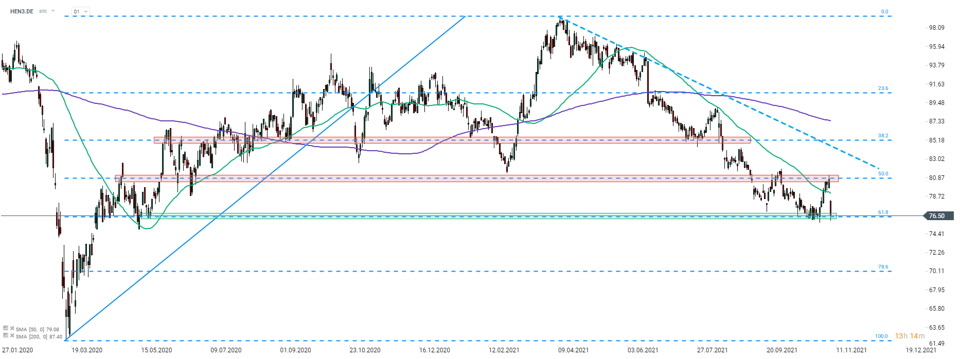 As ações da Henkel (HEN3.DE) caíram após um corte de margem EBIT ajustado para o resto do ano. As ações quebraram abaixo da marca dos 50% dos nívies de Fibonacci e voltaram a testar a zona de suporte nos 76,50 euros, que coincide com a retração de Fibonacci nos 61,8%. Fonte: xStation5