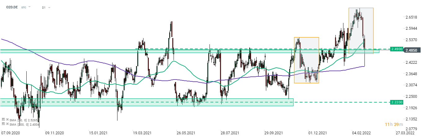 No seguimento da divulgação de um lucro inesperado, os títulos da Telefonica Deutschland (O2D.DE), registaram uma queda no inicio da sessão de hoje. A ação caiu abaixo da zona de suporte, na zona dos €2.49 e testou a media móvel 200 (linha violeta). Os compradores conseguiram defender esta área e agora estão a tentar iniciar um movimento ascendente para acima da zona dos 2.49€ conforme podemos verificar. Fonte: xStation5