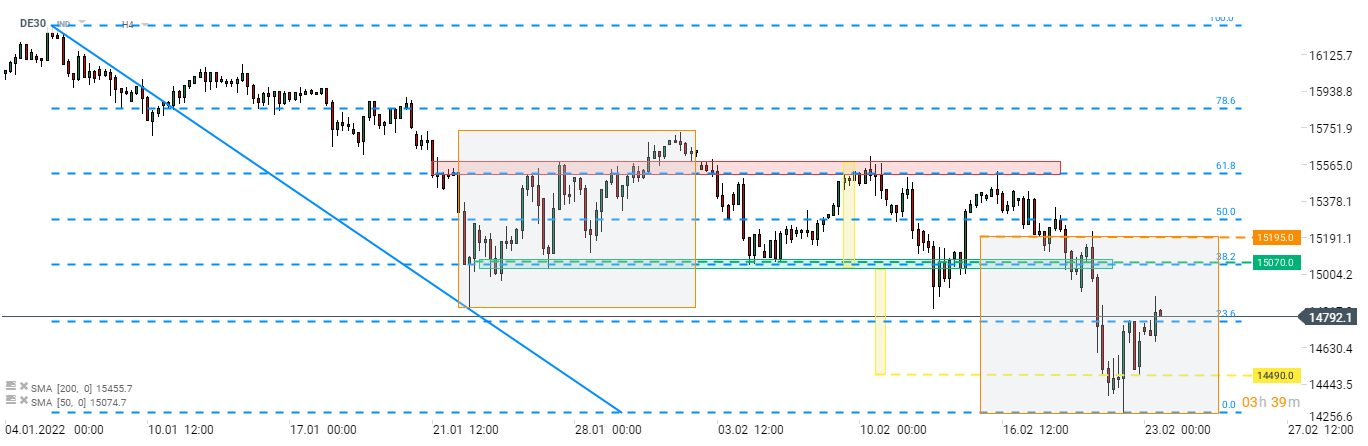 O DE30 quebrou agora em baixa resumindo a sua tendencia baixista (caixas laranja). Esta queda foi interrompida perto da zona dos 15.300 pts tendo sido lançado um movimento ascendente. O índice alemão já valorizou cerca de 23,6% desde a mínimo registado, sendo que esta movimento em baixa foi iniciado no início de 2022. A próxima resistência pode ser observada na zona dos 38,6% da retração fibonacci, isto é, na área dos 15.070 pts coincidindo assim com o limite inferior da zona que estava a ser negociada, tendo sido quebrada em baixa. No caso de vermos uma quebra acima deste obstáculo, a atenção deslocar-se-á para a área de 15.195 pts, onde se pode encontrar a próxima resistência.
