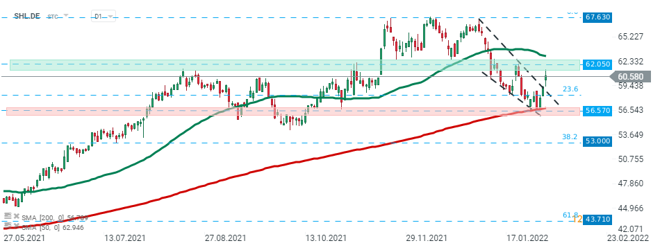 As ações da Siemens Healthineers (SHL.DE) têm sido prejudicadas com o recente sell-off no mercado, mas os vendedores não conseguiram quebrar abaixo da SMA de 200 períodos (linha vermelha).