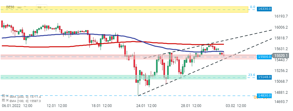 DE30 - apesar do início otimista da sessão de ontem, os compradores não conseguiram manter o preço acima da SMA 200 períodos (linha vermelha). Atualmente, o índice está novamente a testar a marca dos 15.550 pts que coincide com o limite inferior da estrutura. Se os vendedores conseguirem quebrar abaixo dos 15.550 pts, então a zona de suporte marcada pelos 15148 pts pode estar em risco. Esta zona coincide com os níveis de Fibonacci nos 23,6%. Por outro lado, se os compradores conseguirem recuperar o controlo, o movimento de alta poderá movimentar-se em direção à marca dos 16330 pts. Fonte: xStation5