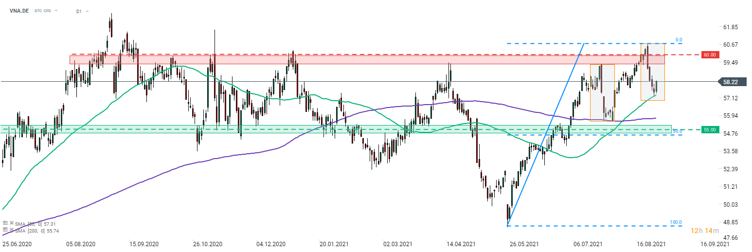 As ações da Vonovia (VNA.DE) têm estado a ser negociadas em baixa nos últimos dias. No entanto, as quedas foram interrompidas junto da média móvel de 50 períodos e desde então que os compradores têm conseguido ter o controlo do preço. Enquanto a força compradora continuar presente, o movimento de alta pode ser estendido em direção à resistência de curto prazo nos 60 euros. Fonte: xStation5
