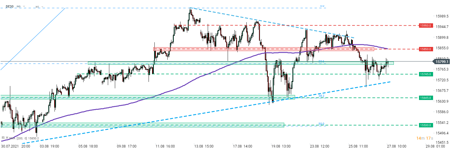 DE30 voltou a registar quedas durante as negociações dos futuros, mas após a queda inicial, o índice começou a lateralizar entre os 15.745-15.800 pts. O limite superior dessa zona de consolidação é marcada pela retração de Fibonacci nos níveis 23,6%.