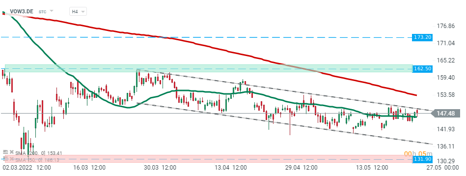 As ações da Volkswagen (VOW3.DE) têm sido negociadas dentro dum canal descendente ao longo dos últimos meses. Durante a sessão de hoje os compradores voltaram a tentar quebrar acima do limite superior da estrutura, mas até agora sem sucesso. Caso ocorra uma quebra acima do limite superior, o movimento de alta poderá prolongar-se em direção à marca dos 162,50 euros. Fonte: xStation5