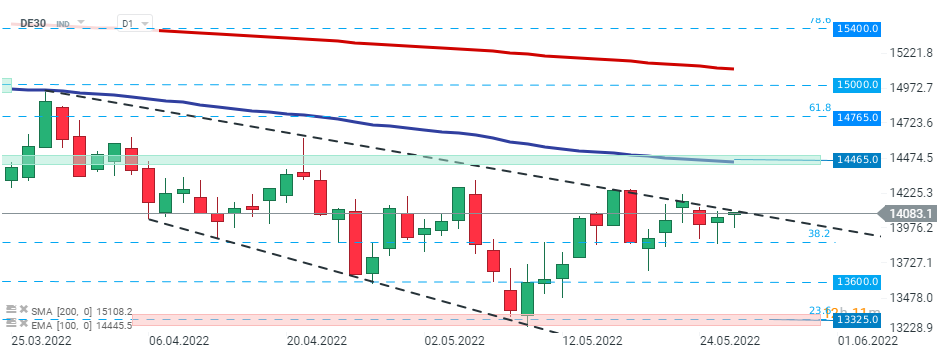 DE30 continua a recuperar depois dos vendedores não terem conseguido ultrapassar abaixo da marca dos 13325 pts, que coincide com o limite inferior da estrutura e dos níveis de Fibonacci nos 23,26%. Fonte: xStation5