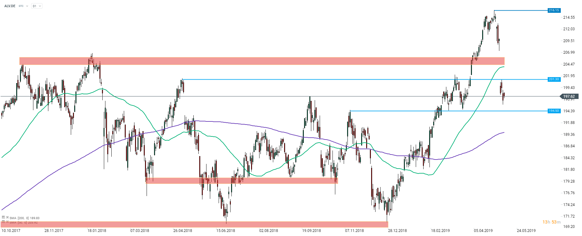 A mais recente liquidação do mercado de ações fez com que o preço da ação da Allianz (ALV.DE) caísse de um penhasco. A empresa alemã está negociando mais de 8% desde o início de maio. Observe que a Allianz, assim como outros gerentes de investimento, é muito sensível ao mercado geral, portanto, a flexibilização de uma pressão descendente pode ser vista como um alívio para os acionistas. Fonte: xStation5