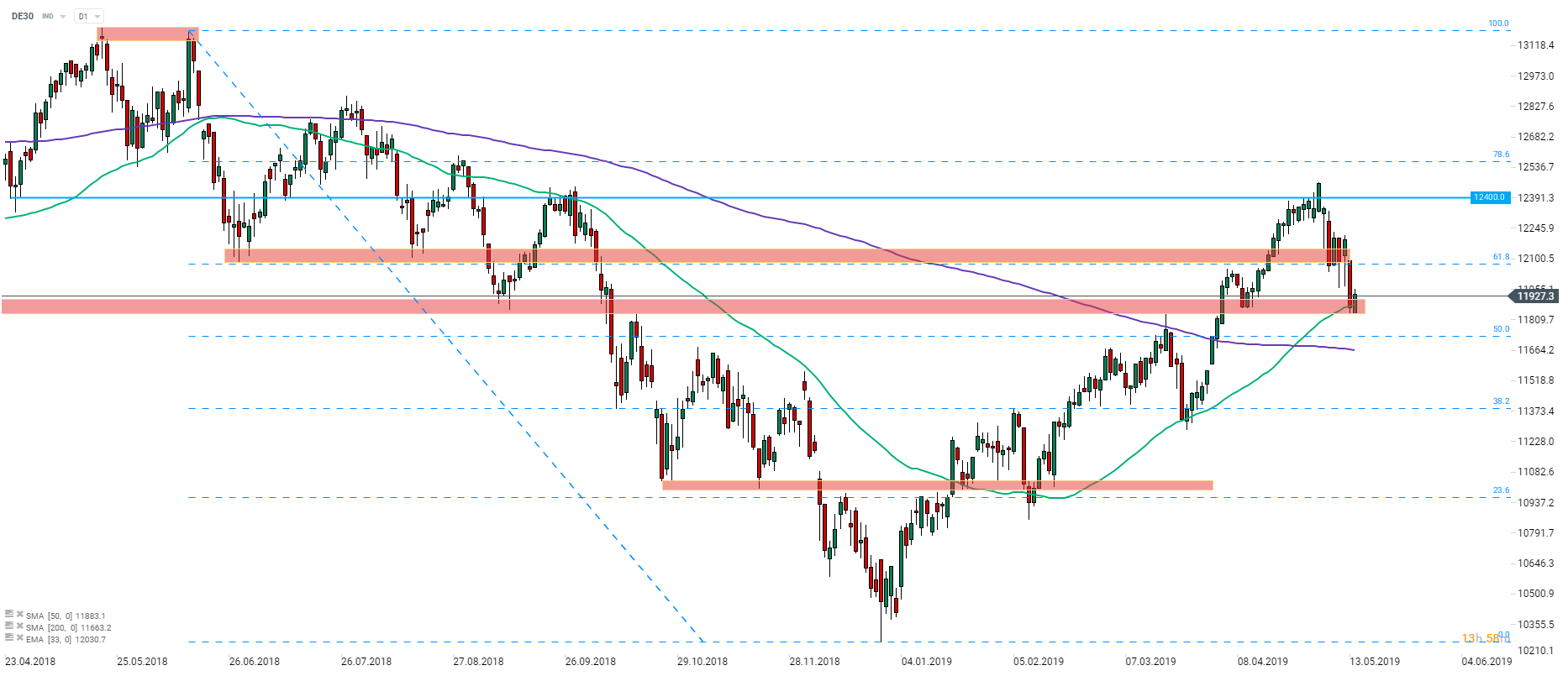 Movimento de queda no índice DE30 foi interrompido na zona de suporte e oscila acima do identificador de 11850 pts. O benchmark alemão recuperou no início da sessão de hoje e pode ser ajustado para testar a zona de resistência que varia acima de 12100 pts no caso de sentimento otimista prevalecer. Fonte: xStation5