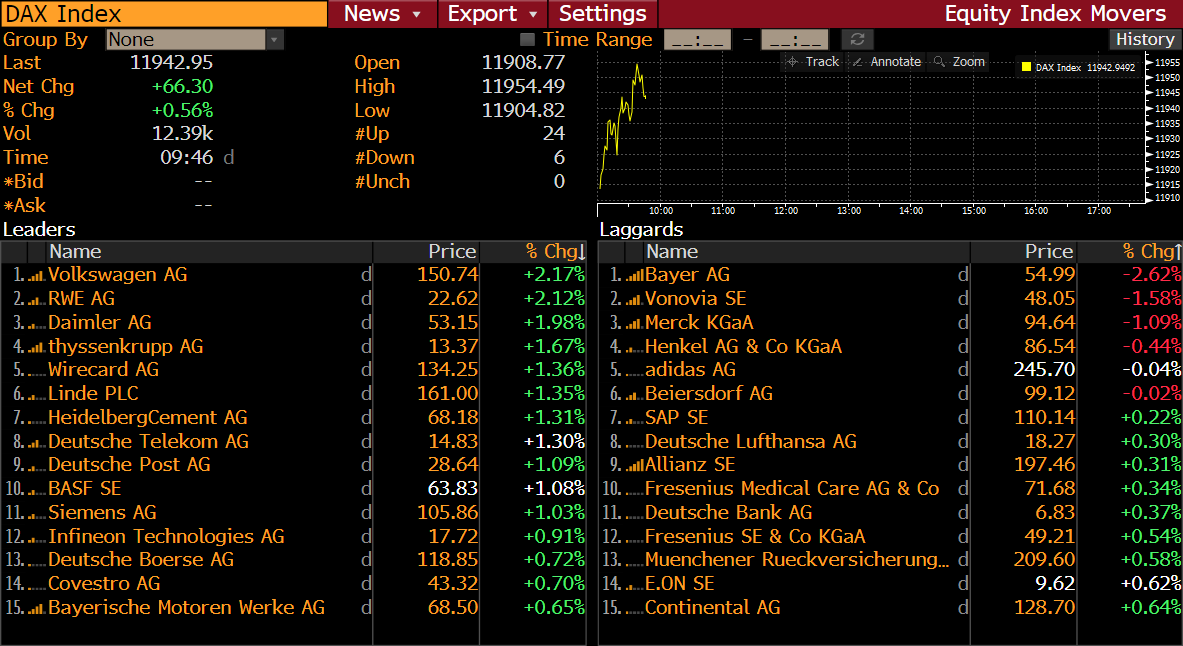 Os dados de vendas de carros sem brilho da China, a ameaça das tarifas de carros dos EUA ou rumores de fusões da Nissan-Renault têm um impacto negativo no sentimento do mercado em relação aos fabricantes de automóveis alemães. No entanto, uma empresa do setor automotivo alemão - a Volkswagen (VOW.DE) - encontrou uma maneira de aumentar o interesse dos investidores nas suas ações. A empresa anunciou que retomou os preparativos para o IPO da sua unidade de camiões - a Traton. Lembremos que a empresa suspendeu os preparativos para o IPO do Traton em março, devido às condições voláteis do mercado. Há rumores de que a Traton pode ser avaliada em US $ 30 bilhões, o que tornaria o maior IPO europeu em 2019 até agora. A Volkswagen disse que quer listar as ações da Traton antes de agosto e que pode vender até 25% dos negócios. Membros do DAX na terça-feira de manhã (8:46 am BST). Fonte: Bloomberg