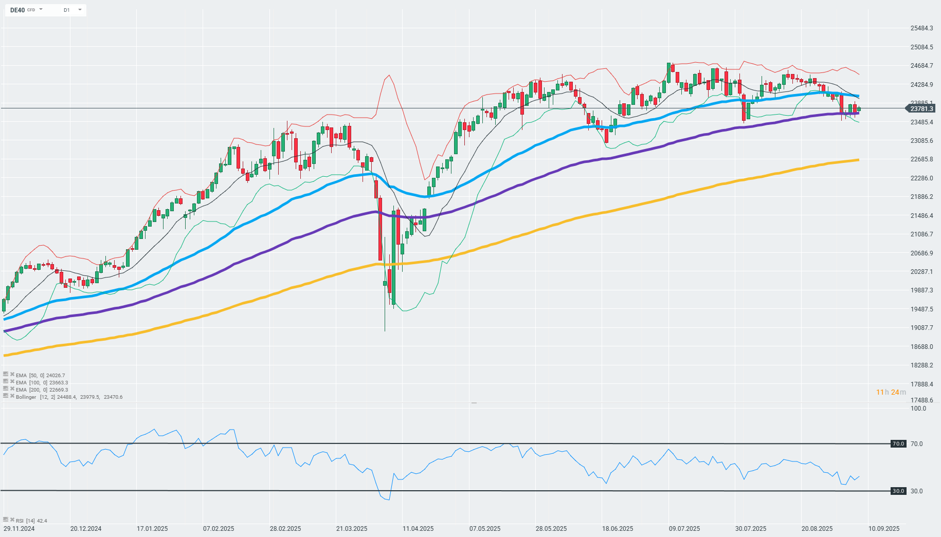 O índice alemão DE40 está a ganhar 0,45% durante a sessão de hoje e está novamente a testar as zonas de suporte marcadas pela média móvel exponencial de 100 dias (curva roxa no gráfico). Enquanto o DE40 permanecer acima dessas zonas, a tendência geral de alta a longo prazo continua sustentável. No entanto, uma quebra sustentada acima da EMA de 100 dias acima mencionada, que anteriormente enfraqueceu a tendência de alta a médio prazo, pode ser crucial para esta recuperação. O RSI dos últimos 14 dias está a ser negociado em níveis próximos de 40 pontos, o que pode indicar que a retração atual ainda é relativamente grande em comparação com a história recente. Fonte: xStation