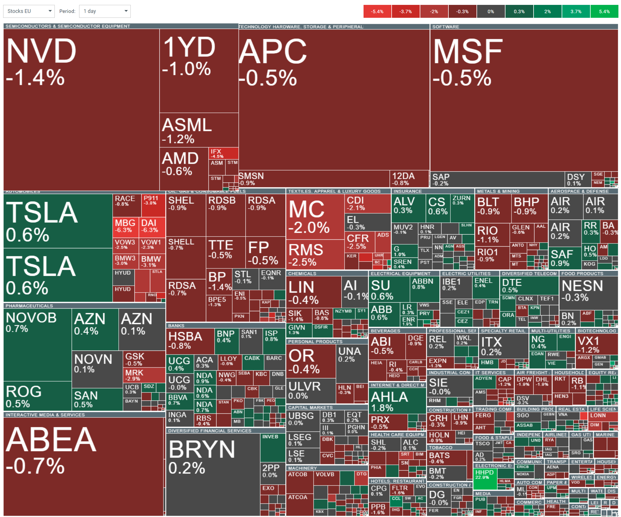 As ações da Mercedes-Benz Group (MBG.DE) caíram 7,7% para um mínimo de quase dois anos, depois de o construtor automóvel alemão ter reduzido as suas previsões financeiras para 2024, estando atualmente a ser negociadas a 55 euros por ação. A empresa citou a fraqueza na China como a principal razão para o aviso de lucros. A Mercedes espera agora que o retorno ajustado das vendas da Cars seja de 7,5% a 8,5%, em comparação com a previsão anterior de 10% a 11%. Prevê-se agora que o EBIT da empresa e o fluxo de caixa livre da atividade industrial sejam significativamente inferiores ao nível do ano anterior. Os analistas da RBC e da Jefferies manifestaram surpresa com a magnitude do corte, com a Jefferies a referir que o corte de 250 pontos base na orientação da margem se deve em grande parte à China.
