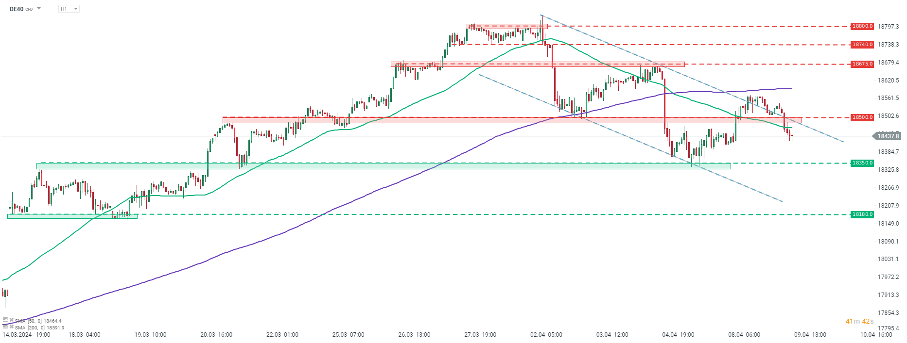 Os futuros do DAX alemão (DE40) tentaram quebrar acima do limite superior do canal de baixa de curto prazo, ontem. Os compradores conseguiram ultrapassar acima desse obstáculo, mas não conseguiram sustentar a tendência de alta e o índice voltou a ser negociado dentro do canal.