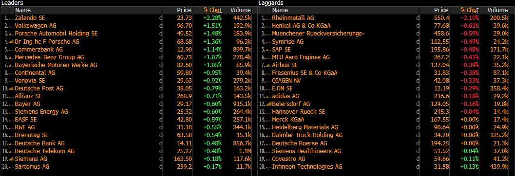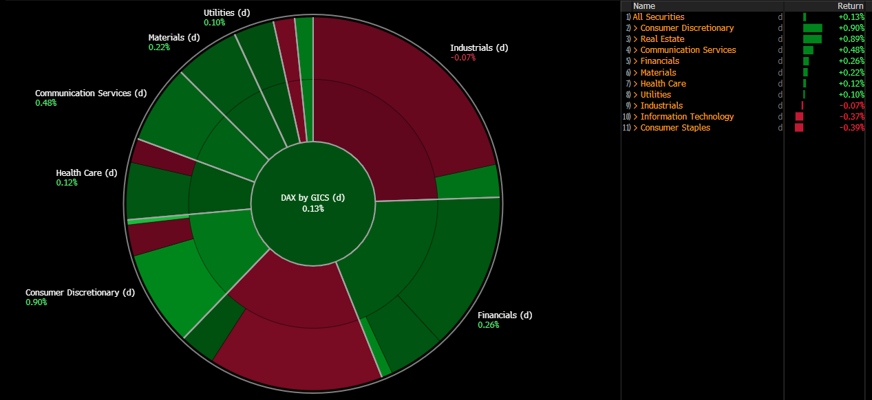 O sector dos bens discricionários é o que apresenta hoje o melhor desempenho no mercado bolsista alemão, registando um ganho de 0,9%. O índice é também apoiado pelo sector imobiliário (+0,9%), enquanto os bens básicos e as IT perdem cerca de 0,4%. Fonte: Bloomberg Finance L.P.