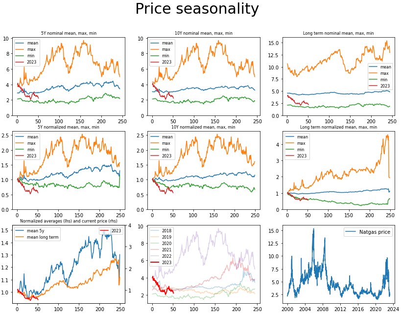 Gráficos de sazonalidade para gás natural. É de notar que o gráfico do meio na coluna mais à direita mostra que o declínio atual dos preços do gás natural é semelhante ao declínio a longo prazo. Por outro lado, o gráfico inferior na coluna mais à esquerda mostra que as médias de 5 anos e de longo prazo sugerem que os preços podem vir a ganhar oferta num futuro próximo. Fonte: Bloomberg, XTB